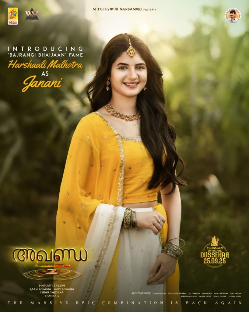 നന്ദമൂരി ബാലകൃഷ്ണയും ബോയപതി ശ്രീനുവും ഒന്നിക്കുന്ന “അഖണ്ഡ 2: താണ്ഡവ”ത്തിൽ ബോളിവുഡ് താരം ഹർഷാലി മൽഹോത്രയും ഭാഗമാകുന്നു. ബ്ലോക്ക്ബസ്റ്റർ ഹിന്ദി ചിത്രം ‘ബജ്രംഗി ഭായിജാനി’ലെ മിന്നും പ്രകടനത്തിലൂടെ പ്രേക്ഷകരുടെ മനസ്സിൽ ഇടം നേടിയ ബാലതാരമാണ് ഹർഷാലി. ‘അഖണ്ഡ 2’ൽ ‘ജനനി’ എന്ന സുപ്രധാന കഥാപാത്രത്തെയാണ് ഹർഷാലി അവതരിപ്പിക്കുന്നത്.