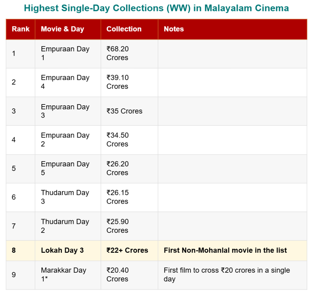 8 Lokah Day 3 ₹22+ Crores Highest for a Non-Mohanlal film